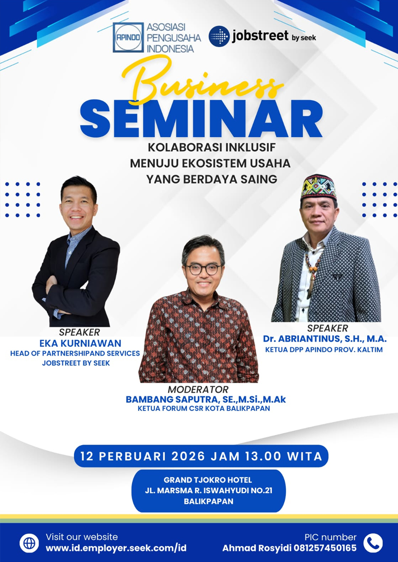 APINDOKALTIM.COM – DPP Asosiasi Pengusaha Indonesia (APINDO) Kaltim bekerjasama dengan Jobstreet by seek, mengadakan seminar bisnis dan diskusi pada Kamis, 12 Februari 2026.